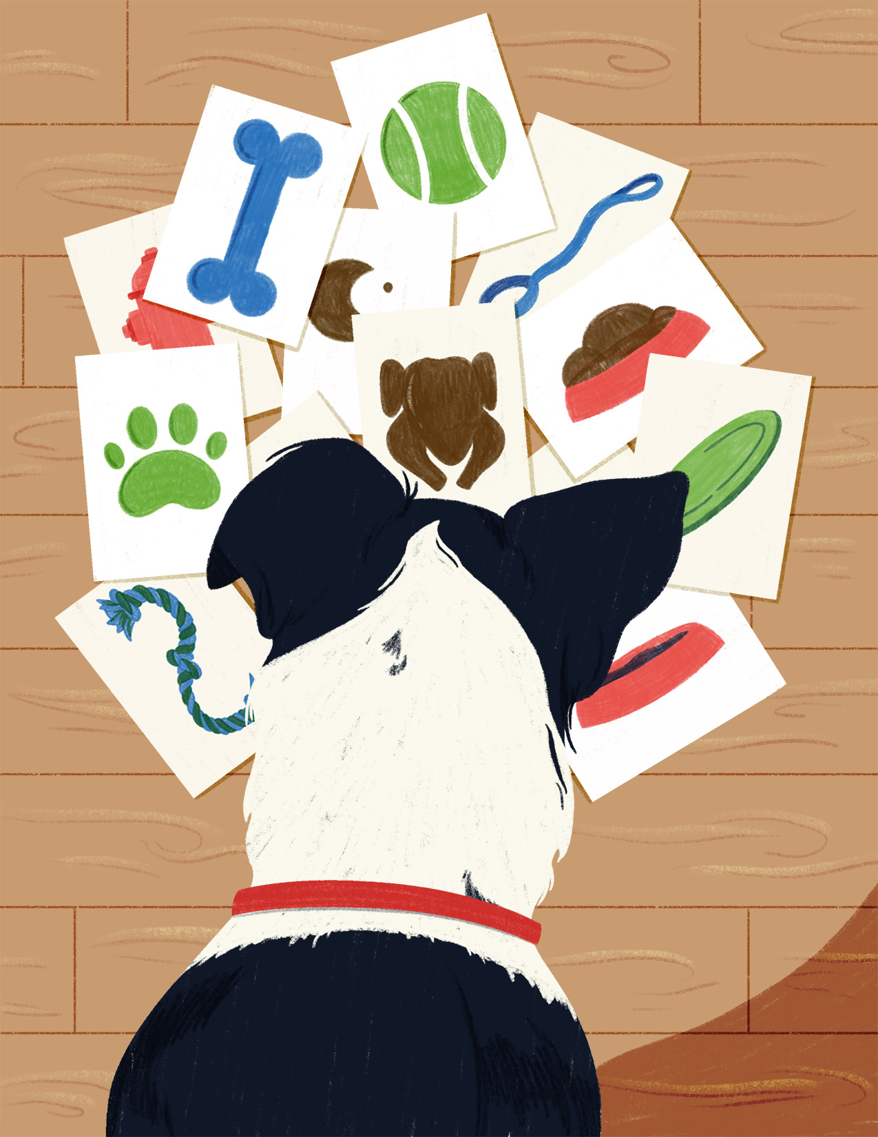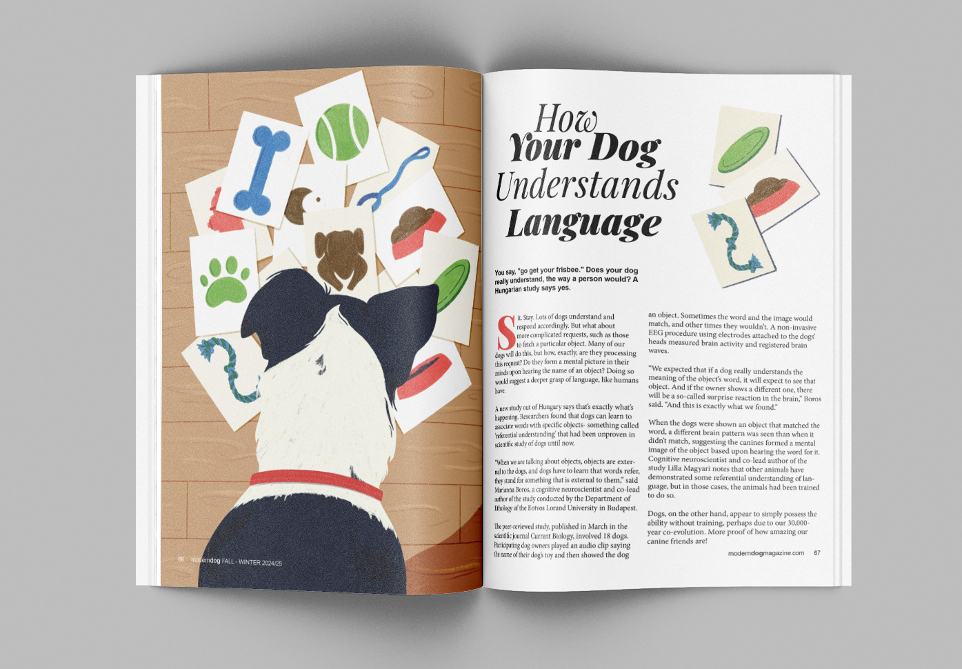 Full-page editorial illustration and mock layout for "How Your Dog Understands Language"