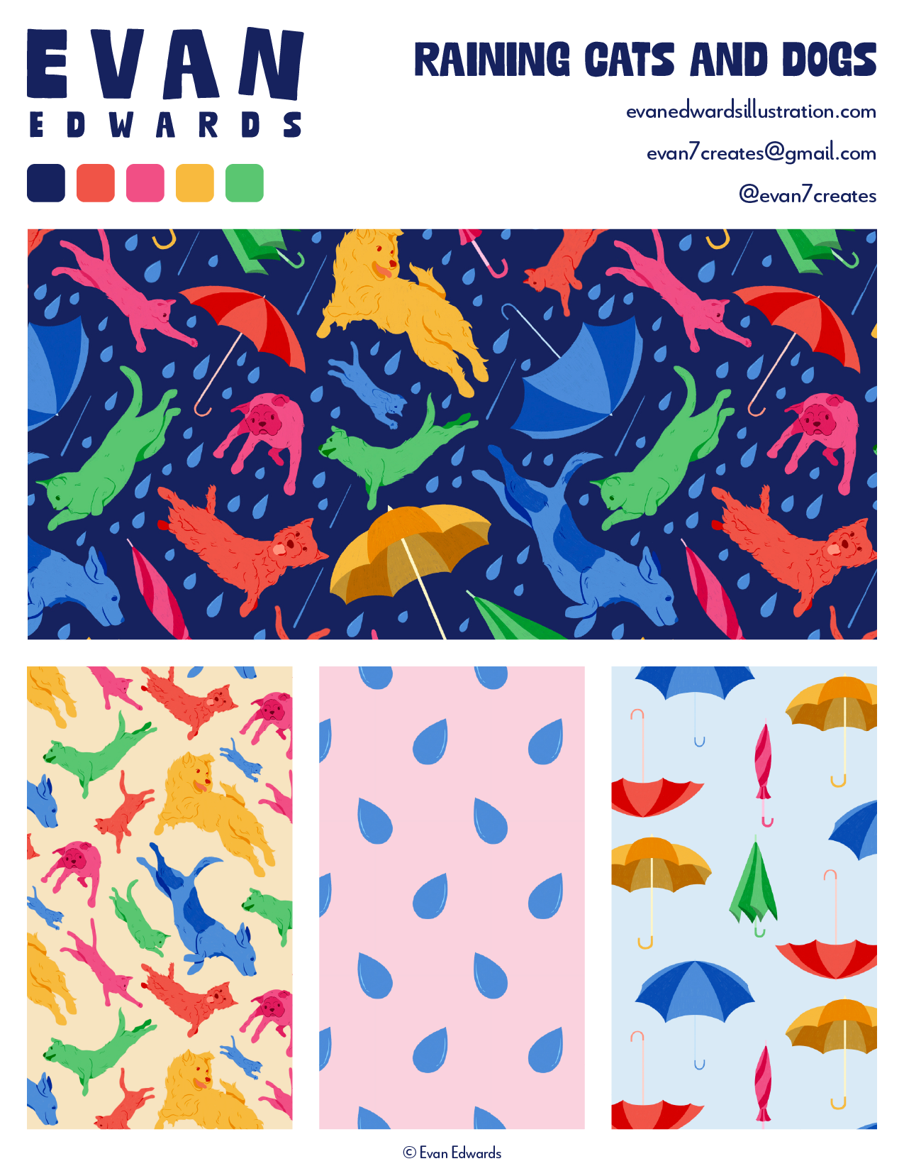 This collection is themed by the phrase “it’s raining cats and dogs". Inspired by a childhood umbrella, I wanted to breathe my own style into these patterns.